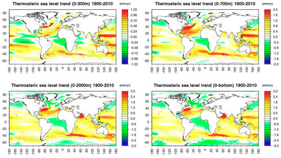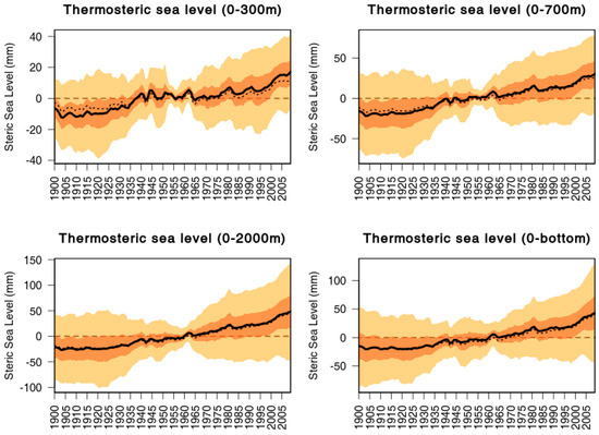 We now evaluate the sea level trends from the centennial reanalyses. We focused our investigation on the steric sea level, because the barystatic signal is potentially less reliable due to the use of climatological (rivers) or potentially biased (precipitation) datasets for the freshwater input. Figure 2 shows the globally averaged steric and thermosteric sea level (Equation (2)) for the entire common period of the 20th century reanalyses (1900–2009), separately for different vertical ranges (0–300 m, 0–700 m, 0–2000 m, and 0 m–bottom). Black lines are from the ensemble mean of the 16 reanalysis members, while dark or light shaded areas correspond to 1 or 3 ensemble standard deviations, respectively. Centennial trends for the four depths are 0.14 ± 0.02 (0–300 m), 0.37 ± 0.02 (0–700 m), 0.58 ± 0.04 (0–2000 m), and 0.47 ± 0.04 (0 m–bottom) mm year−1, where trend uncertainty was calculated with the 95% confidence level estimated by means of ordinary bootstrapping with 1000 replicates [92]. Note that for the total column (full depth) and the periods 1900–1990 and 1971–2010, trends are equal to 0.38 ± 0.04 and 0.86 ± 0.13 mm year−1, respectively, which are in close agreement with the estimates provided by the IPCC AR5 report (Table 13.1 in Church et al. [24]) using CMIP5 (Coupled Model Intercomparison Project) coupled models (equal to 0.37 ± 0.30 and 0.96 ± 0.45 mm year−1, respectively). For the latter period of 1971 to 2010, the IPCC AR5 report indicates that the observed trend of the steric sea level is equal to 0.80 ± 0.45 mm year−1, in close agreement with the 0.86 ± 0.13 mm year−1 trend from the historical reanalysis ensemble. This indicates the close agreement of reanalysis-based estimates with multi-model ensemble, and, during the well-observed period, with observation-based estimates.
