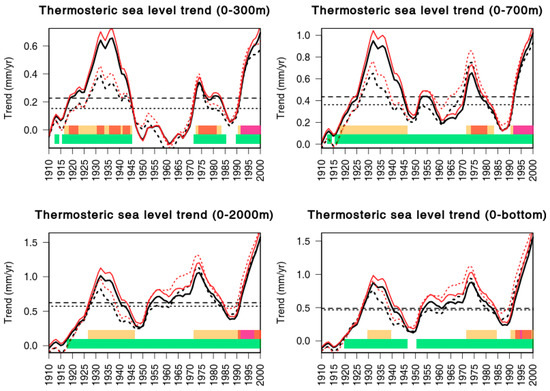 Twenty-year running steric sea level trends for the four vertical layers 0–300 m, 0–700 m, 0–2000 m, and 0–bottom. Black lines: Thermosteric global sea level trends; red lines: Thermosteric sea level trends in the 60° S to 60° N region; dashed lines: Global steric sea level trends. At the bottom of each panel, green bars correspond to the years when the trend is significant, based on the Mann–Kendall trend test [94] at the 95% confidence level. Orange, red, or purple years correspond to the years where the ensemble mean trends exceed one, two, or three times the ensemble spread of the 16-member trends, respectively (corresponding approximately to 70%, 95%, and 99% confidence level. Dashed and dotted horizontal lines correspond to the time-mean thermosteric and total steric trends, respectively.
