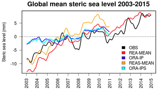 Regarding the contemporary reanalyses (Section 4.1), we used the combination of altimetry and gravimetry data to validate the steric sea level from reanalyses and measure the increase of accuracy of reanalyses across subsequent versions of reanalysis products. To this end, we evaluated the global steric sea level evolution by subtracting the barystatic signal taken from the gravimetry datasets (GRACE RL05, Chambers and Bonin, [87]) to the global sea level signal provided by the reprocessed altimetry dataset from the ESA CCI project [34]. Such timeseries (called SAT) was compared with the latest combination of reanalysis ensemble mean (called REA) and with the ensemble of reanalyses produced before 2013 and published in Storto et al. [40], called ORAIP. Results also report the ensemble mean from the subsampled members that are present in both REA and ORAIP (called “REA subsampled” and “ORAIP subsampled”) for sake of comparing the same family of products, in terms of ensemble size and combinations of ocean models and data assimilation methods. A similar comparison was also performed by Storto et al. [41], but with a smaller subsample of products that included only the CMEMS reanalyses.