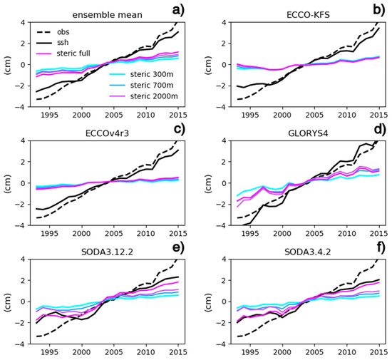 (a) Annual global SSH and steric height at different depths from multi-product ensemble mean during 1993–2015. (b–f) Annual global SSH and steric height at different depths from ECCO-KFS, ECCOv4r3, GLORYS4, SODA3.12.2, and SODA 3.4.2, respectively, during 1993–2015. The global MSL with GIA corrected from AVISO is also presented (“obs” dashed line), which provides a validating dataset for the sea surface height (“ssh”) timeseries.