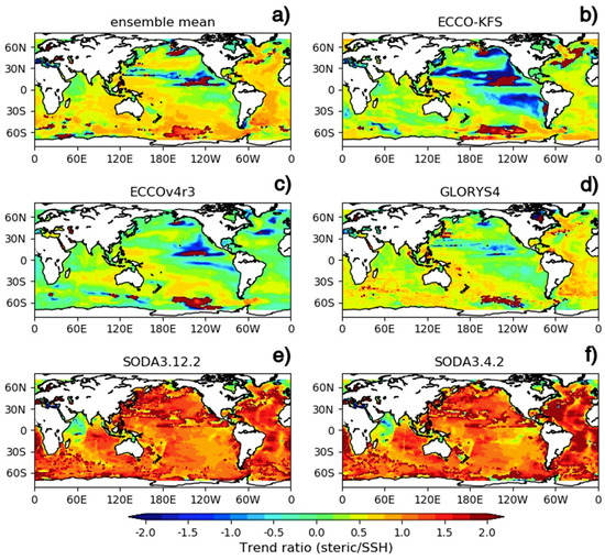 (a) Ratio of SSH trend over steric height trend at full depth from multi-product ensemble mean during 1993–2015. (b–f) Ratio of SSH trend over steric height trend at full depth from ECCO-KFS, ECCOv4r3, GLORYS4, SODA3.12.2, and SODA 3.4.2, respectively, during 1993–2015.