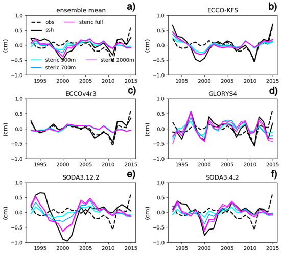 The use of reanalyses in capturing the steric sea level change and variability offers some advantages compared to objective analyses, which is the statistical mapping of observations without a dynamical ocean model. Indeed, additional information coming, e.g., from atmospheric forcing, multiple observing networks, and model physics may overcome to some extent the lack of in-situ observation sampling. Obviously, the synthesis of all these different sources of information implies that errors can potentially propagate from atmospheric forcing, etc. to the reanalysis, which was found non-negligible during unobserved periods or over poorly sampled regions [55,56]. Nevertheless, the accuracy of reanalyses has greatly improved over time. For instance, Storto et al. [41] showed that new vintages of the CMEMS (Copernicus Marine Environment Monitoring Service) reanalyses exhibit improved steric sea level inter-annual variability compared to their predecessors, and their consistency increases especially in under-sampled regions, such as the Southern Ocean. Thus, state-of-the-science reanalyses have acquired the confidence of the climate community.