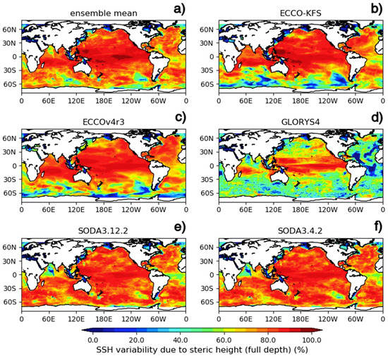 (a) Percentage of SSH inter-annual variability explained by steric height at full depth from the multi-product ensemble mean during 1993 to 2015. (b–f) Percentage of SSH inter-annual variability explained by steric height at full depth from ECCO-KFS, ECCOv4r3, GLORYS4, SODA3.12.2, and SODA 3.4.2, respectively, during 1993 to 2015.