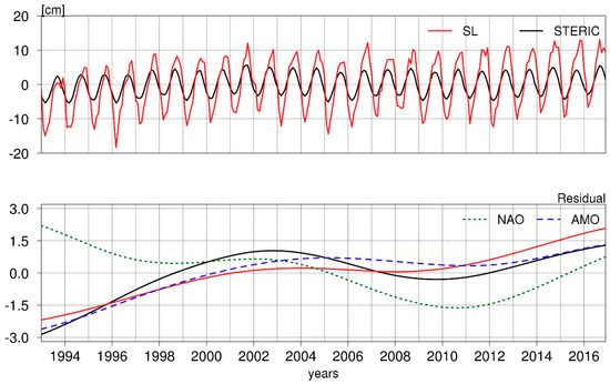 where and are the gravitational acceleration and the reference seawater density, respectively. The inverse barometer effect has practically no contribution at the global scale and it is not further analyzed, although locally it may exhibit a non-negligible contribution to the sea level trends [71,72]. The steric sea level component can be further approximated to the sum of the thermo () and halo () steric components by computing the density anomaly at constant time-averaged salinity () or temperature (), respectively, i.e.,: