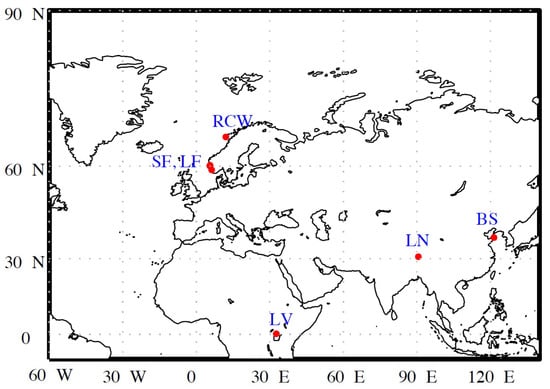 World map with solid red dots indicating the six study sites: LV = Lake Victoria, Uganda; LN = Lake Namtso, Tibet; BS = Bohai Sea, China; SF = Samnangerfjord, Norway, LF = Lysefjord, Norway; RCW = Røst Coastal Water, Norway.