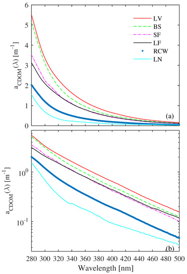 Samples collected from LN, BS, and RCW (Table 1) were analyzed as follows. Water samples were filtered through Whatman Polycarbonate filters (diameter 47 mm, pore size 0.22 m) at low vacuum pressure on the day they were collected, and the filtrate was collected in pre-washed bottles. The bottles were pre-rinsed three times with filtered sample water to minimize the possibility of contamination. At some locations and depths, duplicate samples were prepared. The CDOM samples were stored in a dark refrigerator until analysis. Such preparation and storage of CDOM samples have been shown to be sufficient for avoiding microbial degradation for more than five months [48,49]. Prior to analysis, the CDOM samples and Milli-Q water were acclimated to room temperature. The absorbance spectra were recorded at wavelengths in the range from 200 to 900 nm with 2 nm increments using a dual-beam Shimadzu spectrophotometer (UV-1800) equipped with a 10 cm quartz cuvette. The detection limit for abs in the Shimadzu spectrophotometer (UV-1800) is ±0.008. Baseline data were obtained by filling Milli-Q water both in the sample and reference cells, and baseline correction was obtained by subtracting the offset from each sample spectrum.