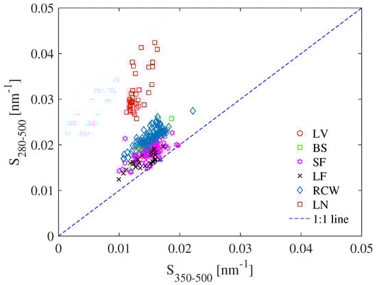 Several authors [8,32,36] have pointed out that the CDOM absorption spectral slope S depends on the wavelength interval used for fitting, which is also confirmed by our data. Thus, scatter plots of the spectral slopes derived for the wavelength intervals 280–500 nm versus 350–500 nm show that the values of are generally higher than the values of for all water bodies (Figure 3). It can also be seen that all S values for the different water bodies are closely connected, except for the S value for LN. The reason why the CDOM absorption coefficients for LN water samples consistently are separated from those for the other water bodies, as revealed by high S values in Figure 3, could be due to the fact that LN is a high-altitude mountain lake with very low levels of high molecular CDOM in the freshwater inlets. This is probably a consequence of extreme environmental conditions, characterized by a poorly developed soil and vegetation, and high UV radiation levels because of increased solar radiation with altitude [18,19], and the existence of a low total ozone column during summer [67]. Therefore as shown in Table 3, LN had both the highest mean value of and the lowest mean value of . Increases in the spectral slope of CDOM as a result of photo-bleaching have been reported [20,21,22]. However, the derived values of S for LN water, are higher than corresponding values for lakes on the Yungui Plateau, where the mean value of was found to range from 0.0146 to 0.0232 nm [37]. Excluding LN, the mean value of S for the other five study sites was found to vary in the range 0.017–0.022 nm, and an even narrower range of 0.014–0.015 nm was found for (Table 3).
