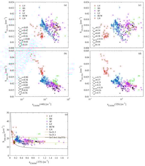 Scatter plots of (a) and (b) for all six study sites versus the CDOM absorption coefficient at 440 []. Scatter plots of (c) and (d) for all six study sites versus the CDOM absorption coefficient at 320 []. r is the correlation coefficient between or and the natural logarithm of or for each study site as specified by the subscript. is the correlation coefficient for all study sites. (e) Scatter plots of the CDOM absorption spectral slope for all study sites versus the CDOM absorption coefficient at 375 []. Black curve is drawn after Stedmon and Markager [31].