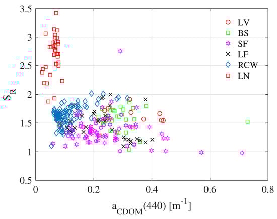 To investigate possible effects of UV exposure on spectral CDOM absorption characteristics for different water bodies in this study, we calculated the ratio of to . According to Coble [75], only compounds absorbing below 300 nm could resist prolonged exposure in surface water, and Helms et al. [26] showed that both and = / ratios are inversely related to the molecular weight of CDOM. Figure 5 shows the / ratio (we did not have CDOM absorption coefficient data below 280 nm) plotted against . The deviation of the data points for LN from those for the other water bodies, is probably due to photo-bleaching of CDOM. The high values (2.2–4.2) and low values (0.025–0.08 [m]) are indicative of decomposed humic-like substances, and the formation of low molecular compounds, due to strong solar irradiance at high altitudes [34]. With the exception of five outliers, four from SF and one from BS, all the other water bodies had values within the range 1–2.25, with corresponding values within the range 0.05–0.45 [m]. It should be noted that the highly polluted and eutrophic LV had values within narrow ranges, whereas the SF was characterized by larger variations. The fact that the BS data group closely together with values for other marine sites, such as LF and SF, but less closely with values for RCW, could be due to impacts of freshwater discharges, containing clay/mineral particles. RCW is dominated by coastal-oceanic water with lower content of terrestrial DOM [1]. If we ignore the five outliers, another interesting feature of our data is that there is no value <1, which means that , and therefore there is an excess of low molecular weight CDOM at all sites. Also, RCW, BS, and, LV are more impacted by decomposed compounds, with mean values around 1.7, than the Norwegian fjords, where the water is close to its CDOM sources, and therefore less decomposed (i.e., more high molecular compounds) than farther out in the open ocean.