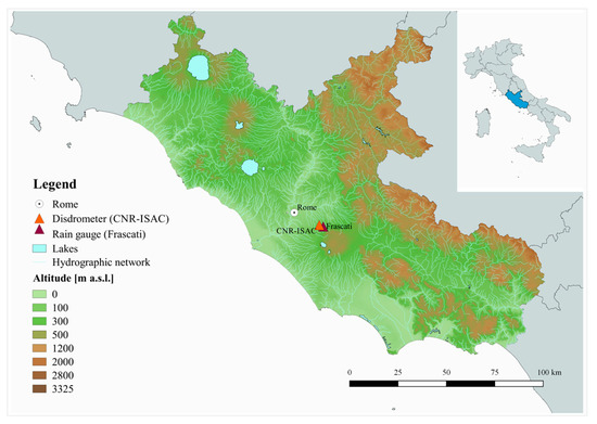 Locations of the case study area in the Lazio region (central Italy), the OTT Parsivel2 disdrometer installed in Rome (ISAC-CNR), and the rain gauge used for analysis.