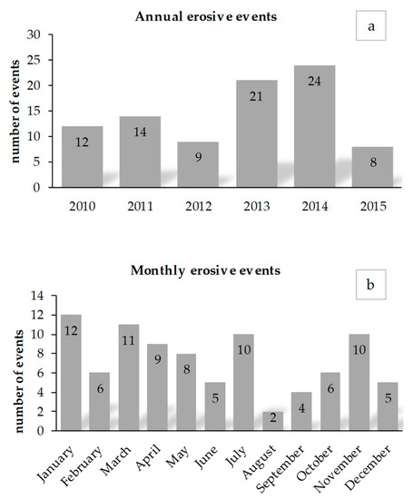 Annual erosive event distribution (a) and total monthly erosive event distribution (b) for the study period.