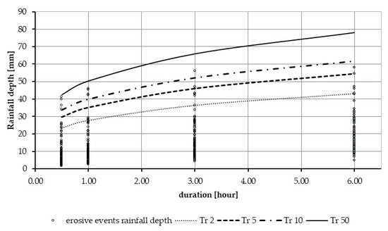 where a and b are positive site-specific parameters, m is an exponent ranging from 0 to 1, and d is the rainfall duration. The parameters were calculated by Mineo and Napolitano [43] by solving Equation (3) numerically. From the DDF curves estimated for the Frascati rain gauge (Figure 3), it was quite evident that potentially erosive events showed depth precipitation amounts lower than the hd,Tr=50yr curve (i.e., no erosive events had a return period higher than 50 years). Therefore, no event was discarded in the subsequent analyses.