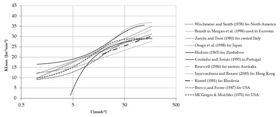 Kinetic-energy–rainfall-intensity (KEmm–I) relationships developed for different pluviometric regimes across the world (after Salles et al. [9]).