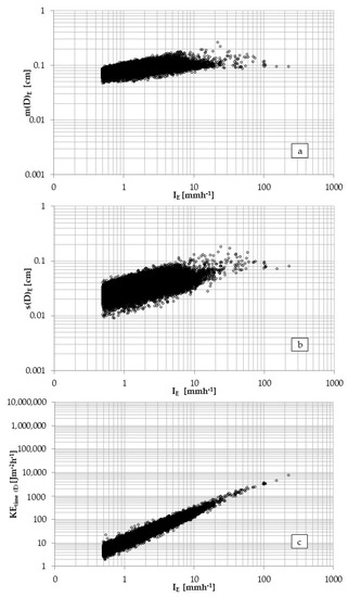 Figure 7. The mean diameter m(D)E and standard deviation s(D)E of DSDs are represented against the rainfall rate (a and b, respectively) after the elimination of DSD measurements distorted by environmental factor effects. Kinetic energy rate (i.e., KEtime(E)) against rainfall intensity IE after the elimination of DSD measurements distorted by the environmental factor effects, panel c. - standard deviation, s(D)E, from 0.0087 to 0.18 cm (Figure 7b);