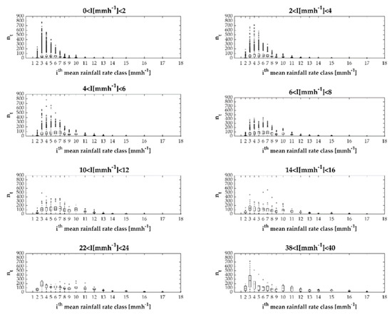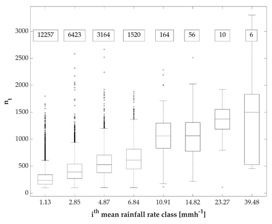 Selecting the 1 min drop spectra by grouping per rainfall rate classes (width of 2 mmh−1), we can observe that (i) the total number of drops falling each minute (i.e., nt) increased with the rainfall intensity, (ii) the range of variability of nt gradually increased with the intensity class, and (iii) the class corresponding to the mean intensity (i.e., 39.48 mmh−1) contained 1 min drop spectra with the highest variability of nt (Figure 9). This suggests that the lower intensity classes consisted of rainfall minutes with more homogeneous characteristics.