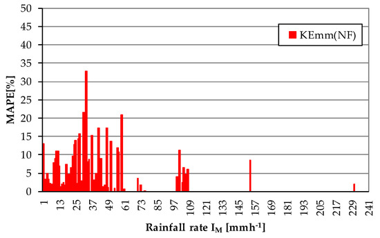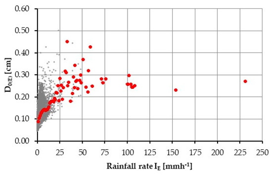 Regarding the investigated drop spectra, the maximum values of D0(E) (Figure 11) and KEmm(E) (Figure 12) were achieved at an intensity threshold of 32 mmh−1. This result confirms the approach proposed by Wischmeier and Smith [23], which found a limit value of 76 mmh−1, calibrated on the U.S. pluviometric regime. Different limit values were assessed for different case studies by other authors, for instance, Rosewell [60] found a value of 100 mmh−1 in Australia, while Carollo et al. [44] found that this value is equal to 40 mmh−1 for the Sicilian pluviometric regime.