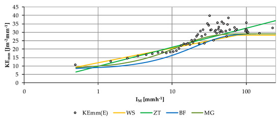 Figure 13 shows the comparison between pairs of KEmm(E) mean values and IM, and pairs of KE–I predicted by WS, ZT, MG, and BF relationships. We can clearly see the different trend of the ZT equation (green line), as it does not consider a threshold value for intensity.