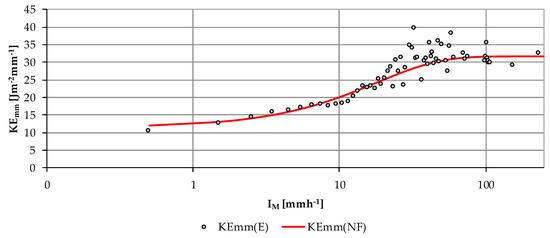 Comparison between pairs of the KEmm(E) mean values against IM, and the pairs of KE–I predicted by Equations (13) and (15)–(17).