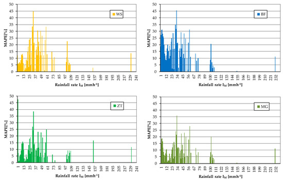 These values were collected for the same time window (i.e., from 20 June 2010 to 28 April 2015). The disdrometer can also record rainfall intensity with a resolution of 0.5 mmh−1. In this regard, as demonstrated in a deep investigation conducted by Adirosi et al. [36], rainfall intensity values collected by a disdrometer can be affected by bias. In this study, this issue was accounted for by filtering the rainfall intensity measured by the disdrometer with the intensity estimated from rainfall drops, as explained below.