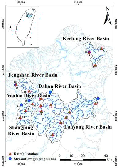 For this study, we selected the Lanyang, Keelung, Dahan, Fengshan, Youluo and Shangping river basins in northern Taiwan as the study area. The Dahan and Keelung Rivers are tributaries of the Danshui River Basin, and Youluo and Shangping Rivers belong to the sub-basin of the Touqian River Basin. This study uses the streamflow gauging station established by the Water Resources Agency of the Ministry of Economic Affairs to define watershed areas of 820.69, 622.8, 204.41, 208.06, 139.07 and 221.73 km2, with average elevations of 955.20, 1614.81, 251.78, 258.84, 977.80 and 1251.48 m, respectively. The map of the basins is shown in Figure 1.