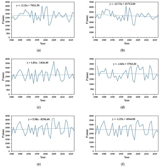 The trend of annual precipitation in northern Taiwan during 1980~2017. (a) Lanyang River Basin. (b) Keelung River Basin. (c) Dahan River Basin. (d) Fengshan River Basin. (e) Youluo River Basin. (f) Shangping River Basin.