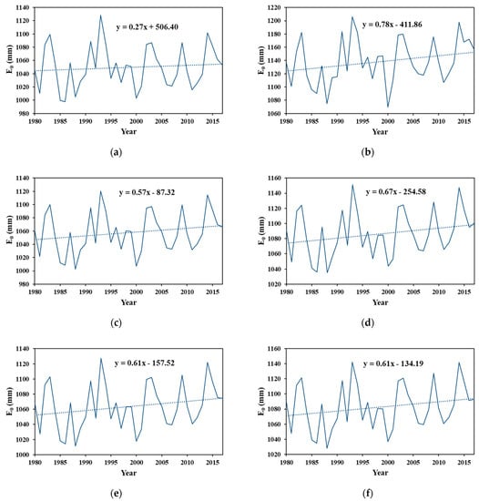 The trend of annual potential evapotranspiration in northern Taiwan during 1980~2017. (a) Lanyang River Basin. (b) Keelung River Basin. (c) Dahan River Basin. (d) Fengshan River Basin. (e) Youluo River Basin. (f) Shangping River Basin.