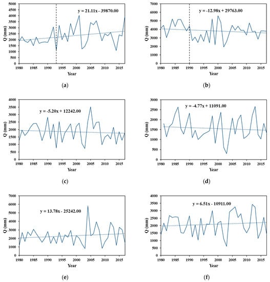 The trend of annual streamflow in northern Taiwan during 1980~2017. (a) Lanyang River Basin. (b) Keelung River Basin. (c) Dahan River Basin. (d) Fengshan River Basin. (e) Youluo River Basin. (f) Shangping River Basin.