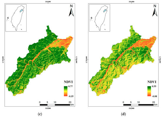 Spatial distribution of NDVI in Lanyang River Basin. (a) NDVI of Lanyang River Basin in 1978. (b) NDVI of Lanyang River Basin in 1993. (c) NDVI of Lanyang River Basin in 2004. (d) NDVI of Lanyang River Basin in 2018.