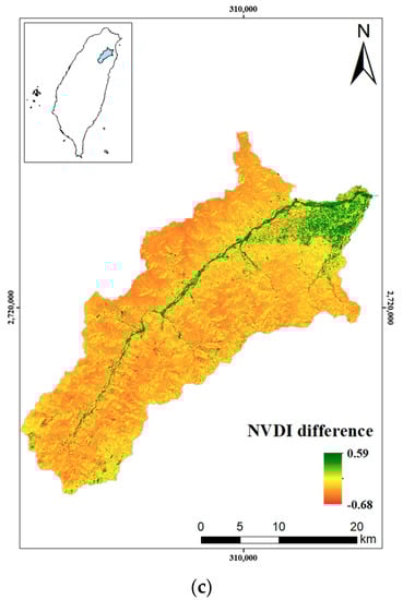 NDVI difference between different periods in Lanyang River Basin. (a) NDVI difference in Lanyang River Basin during 1978 to 1993. (b) NDVI difference in Lanyang River Basin during 1993 to 2004. (c) NDVI difference in Lanyang River Basin during 2004 to 2018.