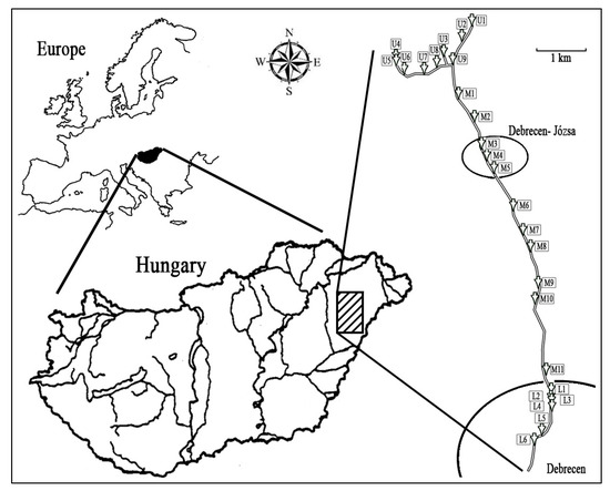 The sampling period lasted from 28 April 2013 to 31 March 2015. During this period, the Tócó Canal was studied in all typical seasons and under typical water conditions. Our sampling times were the following: 28 April 2013, 2 and 5 August 2014, 5 November 2014, and 31 March 2015 (the Tócó Canal dried out in different seasons of the year, and we were not able to track it over one year). We marked out our sampling sites from the source branches of the Tócó Canal—beyond Debrecen-Józsa—to main road No. 33 to Debrecen, a length of about 15 km.