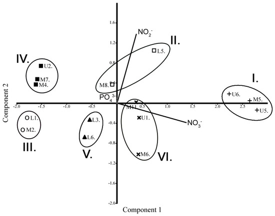 During the summer period, the sampling points could be divided into six groups based on principal component analysis (Figure 3). The first axis explained 87.49% of the total variance, while the second axis explained 10.42% of the total variance. According to the PCA carried out on the basis of the varying concentrations measured at the sampling points, this period was the most heterogeneous of the seasons examined. During the summer, sampling points U5, U8, and M5 belonged to Group I due to the high nitrate and nitrite concentrations. M8 and L5 belonged to Group II due to their high orthophosphate and nitrite concentrations. M2 and L1 belonged to Group III due to their low nitrite and nitrate concentrations. Based on principal component analysis, U2, M4, and M7 belonged to Group IV, which was characterized (in contrast to the previous group) only by a low nitrate ion concentration. Group V included sampling points L3 and L6 and was characterized by a low nitrite concentration. Based on principal component analysis, U1, M6, and M11 were included in Group VI, which was characterized by high nitrate and low nitrite concentrations.