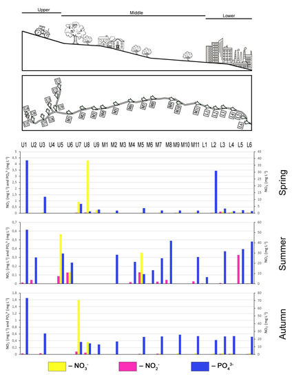 It can be stated that the concentrations of the main variables (nitrite, nitrate, and orthophosphate), which had the greatest impact on the classification of the sampling points of the studied watercourse, were very diverse at different sampling sites both in the same period and in relation to the three seasons studied (Figure 5). There was no single point that had the same main variable (in all of the seasons examined) influencing its characteristics and water quality. Moreover, the different areas (Upper, Middle, and Lower Areas) could not be classified on the basis of a distinct variable. Even during one season, we found that there were marked differences between the individual sampling points within each area.
