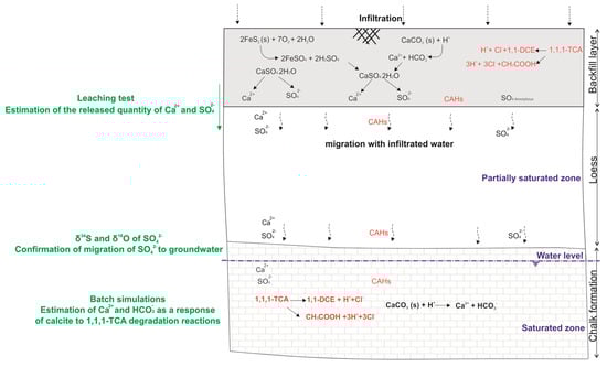 At an abandoned industrial site in Wallonia (South of Belgium), a chalky aquifer intensively used for drinking water supply [] has been locally contaminated by a mixture of CAHs. Local changes in groundwater mineralization have been observed compared to the background composition of groundwater in the aquifer. During the investigations of Palau et al. [], an increase of Ca2+, HCO3−, Cl− and SO42− was observed within the plume of dissolved CAHs. Sulphate concentrations even exceed the EU drinking water standard (250 mg/L) [] in some places, reaching concentration levels as high as 5 times the background concentration. During the investigations of Palau et al. [], mineralization changes has been first explained by 1,1,1-TCA degradation reactions by HY/DH. However, the presence of a backfill layer at the site has allowed to presume the leaching of different chemical compounds with water infiltration that may also affect groundwater composition.
