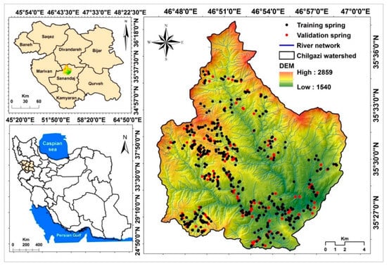 The Chilgazi watershed, which is located north of Sanandaj city, Kurdistan province, Iran, lies between 46°45′ to 46°57′ E longitudes and 35°25′ to 35°28′ N latitudes. This area covers an area of around 272 km2. The elevation of the study area ranges from 1550 to 2859 m (Figure 1). The Ghishlagh Dam is located at the outlet of the Chilgazi watershed. The average annual temperature is 14.2 °C; the average daily minimum temperature in winter is 6.5 °C, and the average daily maximum temperature in summer is about 37 °C. The average annual precipitation is 464.2 mm, such that it mainly occurs in December to April (more than 75%). The climate of the study area based on De-Marttone climatic system is classified as semi-arid []. Most of the area is covered by agricultural lands (23,465 ha) and rangelands (3768 ha). In addition, barren lands, pastures, residential areas, and gardens are other types of land use in the study area. The study area is geologically part of elevated Zagros (Northern Zagros) where joints, gaps, and faults have been created. Also, soil of the study area is mainly semi-deep with predominant sandy-loamy texture. Most of the study area has been covered by the Quaternary deposits, including andesite–basalt (), Sanandaj shale (), and limestone (). In addition, surface water and groundwater are the two sources of water supply, where surface water is often used for irrigation purposes and groundwater is commonly utilized for agricultural production as well as domestic purposes.