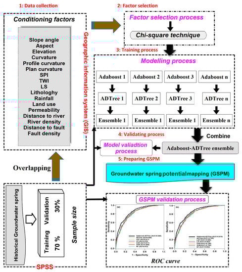In this study, we combined a decision tree classifier, Alternating Decision Tree (ADTree), with a Meta/ensemble classifier, AB—named “AB–ADTree”—in order to spatially predict springs. The framework of the proposed ensemble model is shown in Figure 2. Basically, the GSPM using the proposed model was performed in five steps: (1) Data collection and interpretation; (2) selecting the most conditioning factors using the chi-square technique in modeling; (3) training the AB–ADTree ensemble model; (4) validating and comparing spring models; and (5) preparing groundwater potential maps.