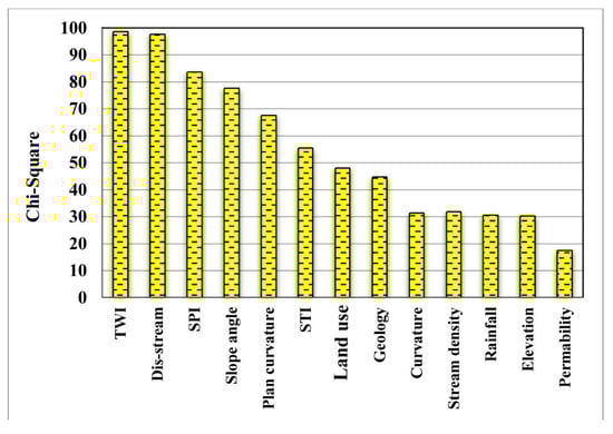 Both models and input data affect the quality of GSPM results []. The influence of conditioning factors on groundwater spring occurrence is different, such that some of them may reduce the model accuracy. The main step in the spatial GSPM is the selection of suitable factors and the elimination of irrelevant conditioning factors to find the most reliable database. In this study, the chi-square attribute evaluation (CSAE) technique, which is one of the most efficient and popular methods [], with 10-fold cross validation for the training dataset was used to assess the prediction capability of conditioning factors. Results of the chi-square test (Figure 3) show that the most important conditioning factors for groundwater spring potential were TWI (AM = 98.598), followed by distance from river (AM = 97.73), SPI (AM = 83.736), slope angle (AM = 77.624), plan curvature (AM = 67.59), STI (AM = 55.488), Land use (AM = 48.146), geology (AM = 44.805), curvature (AM = 31.404), stream density (AM = 31.830), rainfall (AM = 30.530), elevation (AM = 30.304), and permeability (AM = 17.481).