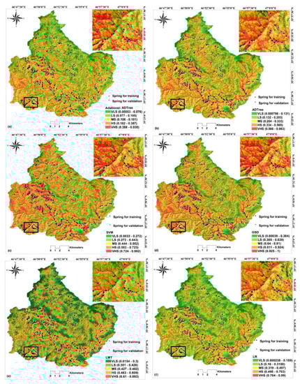 In Iran, most of the people living in rural and urban areas (70%) are dependent on groundwater as a safe water resource []. In recent years, due to climate change and intensive withdrawal of available groundwater resources, many regions of Iran have become dry and semi-dry, which has caused a serious lack of water throughout the country [,,,,,,]. Since groundwater consumption in Iran has been increasing dramatically, development of proper methods to assess the aquifer productivity and groundwater potential areas are badly needed. These methods are essential for future systematic development, profitable management, and arresting the decline of groundwater resources []. Due to the requirement of fresh groundwater increases, plans for groundwater spring potential zones become an important task to successfully determine, manage, and protect groundwater programs. Therefore, groundwater spring potential mapping (GSPM) is important for protecting water quality and managing the use of groundwater []. Hence, GSPM is useful for proper groundwater protection and management [].