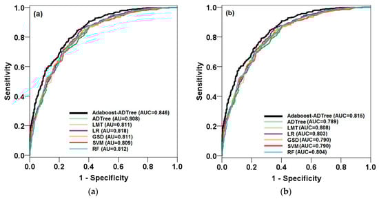 Regarding NPV, AB–ADTree had the highest performance (0.785), demonstrating that 78.5% of pixels were correctly classified as the non-groundwater potential occurrence class, followed by RF (0.748), SGD (0.745), SVM (0.739), LR (0.738), LMT (0.736), and ADTree (0.718). AB–ADTree obtained the highest sensitivity (0.775), showing that 77.5% of the groundwater spring occurrence pixels were correctly classified as the groundwater spring occurrence class, followed by RF (0.748), SGD (0.757), SVM (0.736), LR (0.734), LMT (0.730), and ADTree (0.698). The highest specificity (0.824) of the AB–ADTree model showed that 82.4% of the non-groundwater spring occurrence pixels were correctly classified as the non-groundwater spring occurrence class, followed by ADTree (0.768), LMT (0.755), RF and LR (0.750), SVM (0.748), and SGD (0.712). The AB–ADTree model also acquired the highest performance (0.800) evaluated by the accuracy criterion, followed by RF (0.749), LMT, SVM and LR (0.742), SGD (0.734), and ADTree (0.733). Results of RMSE demonstrated that AB–ADTree had the lowest error (0.375), followed by LR (0.417), LMT and SVM (0.418), ADTree (0.424), and SGD (0.515). Regarding AUC, the hybrid model of AB–ADTree had the highest AUC (0.881), followed by RF (0.818), ADTree (0.817), LR (0.816), SVM and LMT (0.815), and SGD (0.675). The findings prove that the designed hybrid model showed the highest performance in groundwater spring potential prediction based on all criteria used in the training phase of modeling in this research.