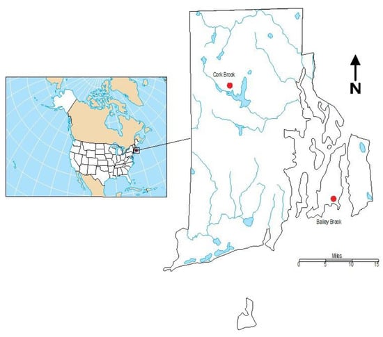 The field sites identified in Figure 1 were chosen for this study to demonstrate impact of spatial variability on source water quality. Both locations are headwater streams for major reservoirs in Newport and Scituate, Rhode Island. Source water entering Newport WTPs, e.g., Bailey Brook, has received higher loads of nutrients from a variety of sources due to its location in an urban area [34]. Cork Brook, although forested [35], has experienced seasonally high loadings of precursors, particularly during intense precipitation events. It is expected that the different land use activities associated with each field site will produce varying levels of precursors [20,25,27], later affecting the formation of NDMA upon water treatment.