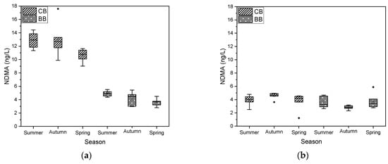 NDMA concentrations in product water after (a) 24 h monochloramine CT, and (b) 72 h monochloramine CT, corresponding to sample site and season. Plots based off of all NDMA concentrations regardless of where the sample was collected from the treatment system. CB = Cork Brook, BB = Bailey Brook.