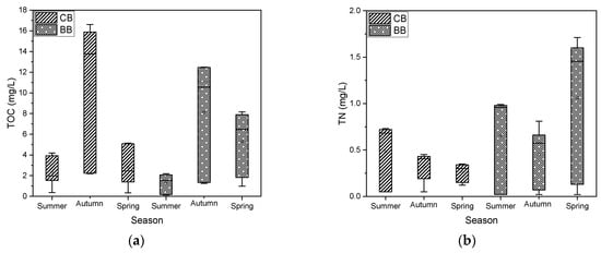 (a) TOC, and (b) TN concentrations of processed samples before disinfection, corresponding to sample site and season. Plots based off of all TOC and TN concentrations regardless of where the sample was collected from the treatment system. CB = Cork Brook, BB = Bailey Brook.