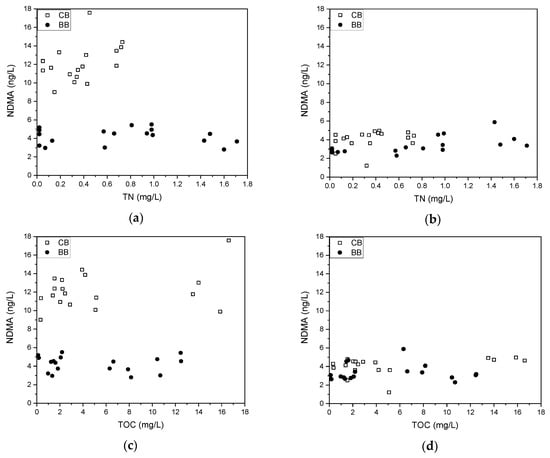 Scatter plots showing no relationships between TN and NDMA, and TOC and NDMA. (a,c) = 24 h CT; (b,d) = 72 h CT. CB = Cork Brook, BB = Bailey Brook.