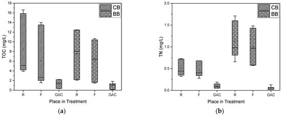 (a) TOC, and (b) TN precursor concentrations of processed samples, corresponding to the sample’s position in the treatment system. Samples were collected at three major phases during treatment: R = untreated raw water; F = dual-media filtration effluent; GAC = dual media filtration + GAC filtration effluent. Plots based off of all TOC and TN concentrations regardless of seasonal sampling event. CB = Cork Brook, BB = Bailey Brook.