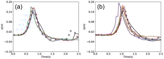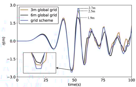Figure 13. The numerical difference first occurs when the lowest water level appears and remains afterwards. Because of wave propagation and energy attenuation, the capture capability of the mesh-scheme solution still has an advantage, but it is not as considerable as presented in the NF. The local refinement mesh scheme, considering NF and PF, has higher precision than the global coarse mesh under the same conditions.