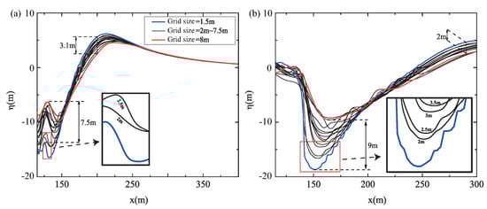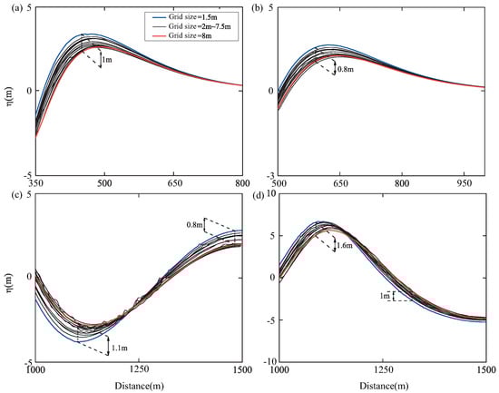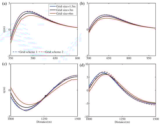 Figure 12). Although the range of propagation is consistent, the wave height is different at 30 s. As the mesh size decreases, the calculation result shows a decrease in the intensity of the wave. However, the mesh-scheme rendering preserves the previous calculation accuracy and captures capabilities with the propagation-field coarse mesh. To monitor the wave height near the dam, a measuring point is placed to record the date and the results of time-dependent wave height under three solutions are depicted in