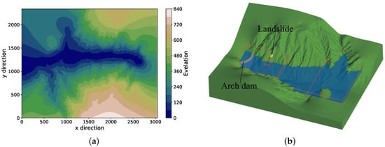44]. The computational meshes includes not only the watershed but also the free space for the development of water waves so that the total mesh volume can be larger than the initial water volume. Given that fluid volume is a function during the whole process, the wet boundary is updated with the the progress of calculation. Thus, the wet–dry transformation is achieved. More details of the physical and numerical model are described in Flow Science [