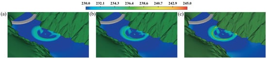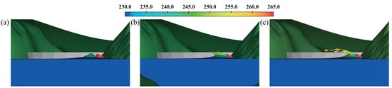 Figure 11). The highest wave result presented in three solutions are 16.59, 19.58, 26.94 m. By comparing the dam-top elevation (dam height is 250 m, and still-water depth is 230 m), the wave level is 6.94 m higher than the dam top in the mesh scheme solution, whereas that of the mesh solution of 3 and 6 m are 0.42 and 3.41 m lower than the dam top, respectively. Although the location producing the highest wave is in block 1, the accuracy of the calculation in block 2 is considerably improved as block 1 is refined. The capture capacity under the mesh scheme increases by 37.59% compared with the 3 m global mesh. The breaking and splashing of waves can, thus, be captured. When the landslide is very close to the dam, the calculation result of this first impulsive wave plays a decisive role and may cause an overtopping process [