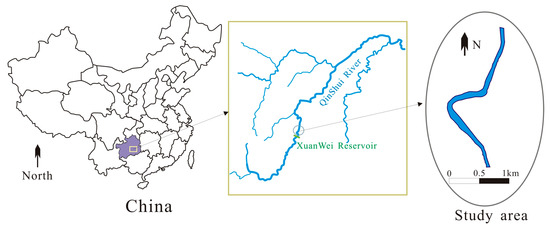The Qingshui River, located in the upper reaches of the Yuanjiang River, belongs to the Yangtze River system in China. It is located in the southeast of Guizhou Province and southwest of Hunan Province, with a drainage area of 15,000 km2. Hills and mountainous regions compose most of the Qingshui River Basin. The basin has abundant rainfall, warm climate, rich oil, and diverse types of aquatic habitats. The Xuanwei reservoir is located in the upper reaches of the mainstream of the Qingshui River, with a catchment area of 1337 km2. The design parameters of the reservoir include a normal water level of 681 m, a dead water level of 657 m, a total storage capacity of 139.80 million m3, and an average annual storage flow of 903.39 million m3. Among the fish in the study area, the largest number of cypriniformes (34 species) accounted for 65.4% of the total number of fish species by the scene investigation and sampling in the field, followed by 17.3% perciformes (9 species), 15.4% siluriformes (8 species), and 1.9% synbranchiformes (1 species). There is a spawning ground from the reservoir to the downstream river channel with a length of 3 km. The main fish species in the spawning ground is Ctenopharyngodon idella which produces drifting eggs. The bottom of the riverbed is an open rocky beach formed by pebbles and river sand. By considering the 3 km river channel downstream of the reservoir as a study case, the influence of hydraulic factors on fish spawning is simulated and analyzed. The location of the study area is shown in Figure 1.