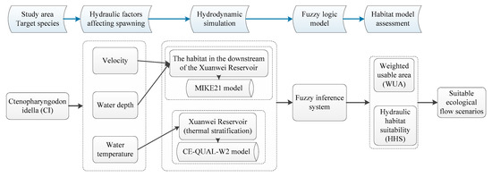 In this study, the C. idella in the study area was used as the target species to study the flow and water temperature effects of C. idella during spawning. This study specifically analyzed the following three main factors affecting the spawning of C. idella: velocity, water depth, and water temperature. Two hydrodynamic models were used to simulate the hydraulic conditions of reservoir and the downstream habitats of reservoir. MIKE21 simulated the spatial distribution of velocity and water depth under different flows in the habitat. CE-QUAL-W2 simulated the water temperature stratification of reservoirs under different inflows and outflows. The simulation results of velocity, water depth, and water temperature were used to construct a fuzzy model [31,40] to comprehensively analyze the effects of the three factors on C. idella spawning. The simulation results of the fuzzy logic-based habitat suitability model were analyzed and evaluated by WUA and HHS, and the best flow management scenario in the study area was finally obtained. The overall framework of the habitat model is shown in Figure 3.