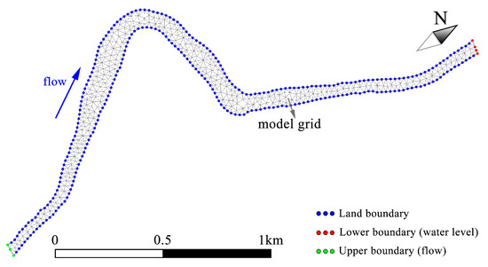 Tests of numerical experiments and results of the practical applications showed that this model can simulate the water flow movement over complex terrain accurately [44]. The MIKE21 model was used to divide the downstream habitat of the Xuanwei Reservoir into 796 triangular grids, with a maximum area of 523.49 m2 and a minimum area of 130.33 m2. The measured outflow time curve of the reservoir was taken as the upper boundary of the model. The measured water level time curve at 3 km from the reservoir was taken as the lower boundary of the model. The model simulated the velocity and water depth distribution in the habitat under different outflows. Habitat grid model is shown in Figure 5.